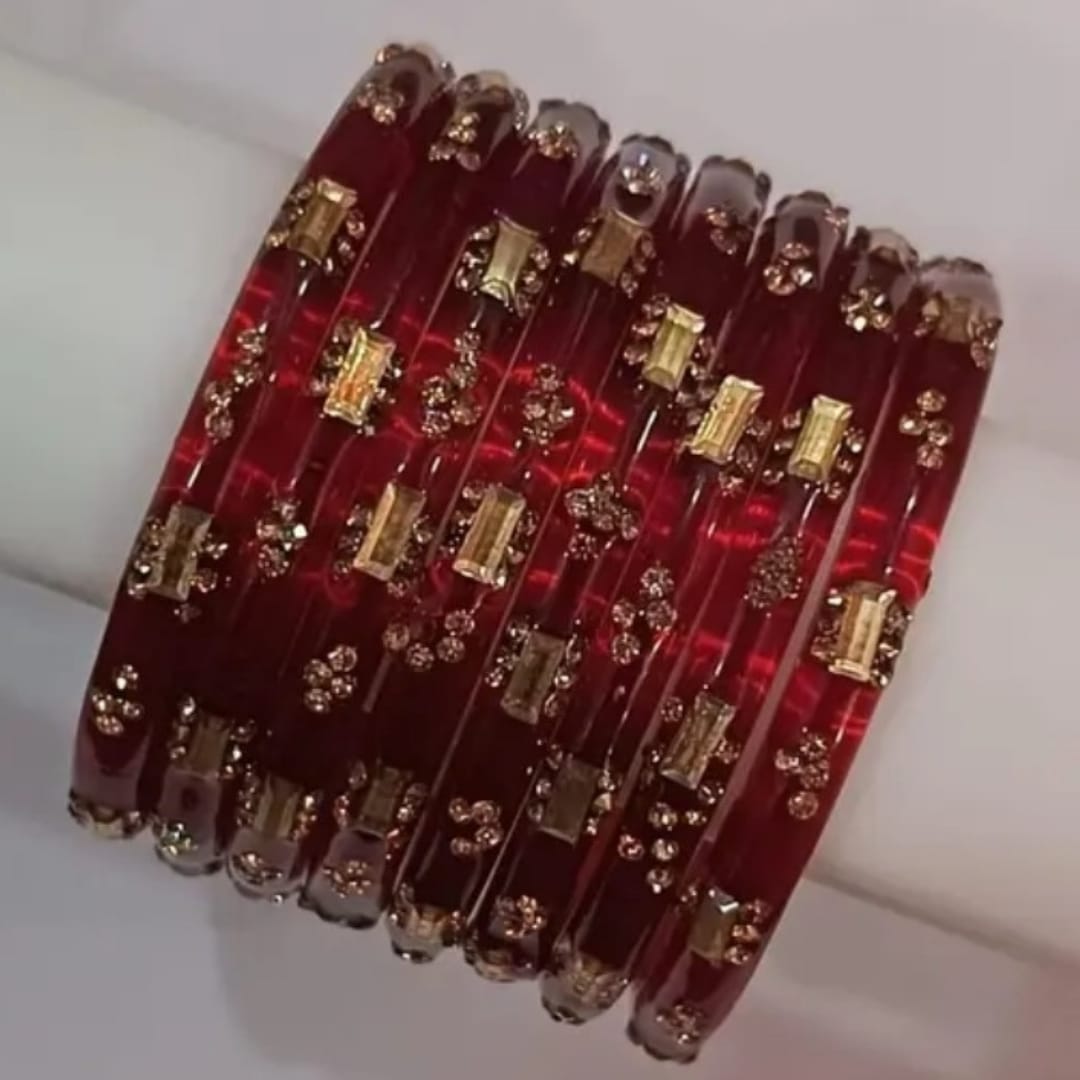 Name: Glass Bangles with Zircon Gemstone & Bead Detailing – Glossy Finish Chudi Set for Women & Girls